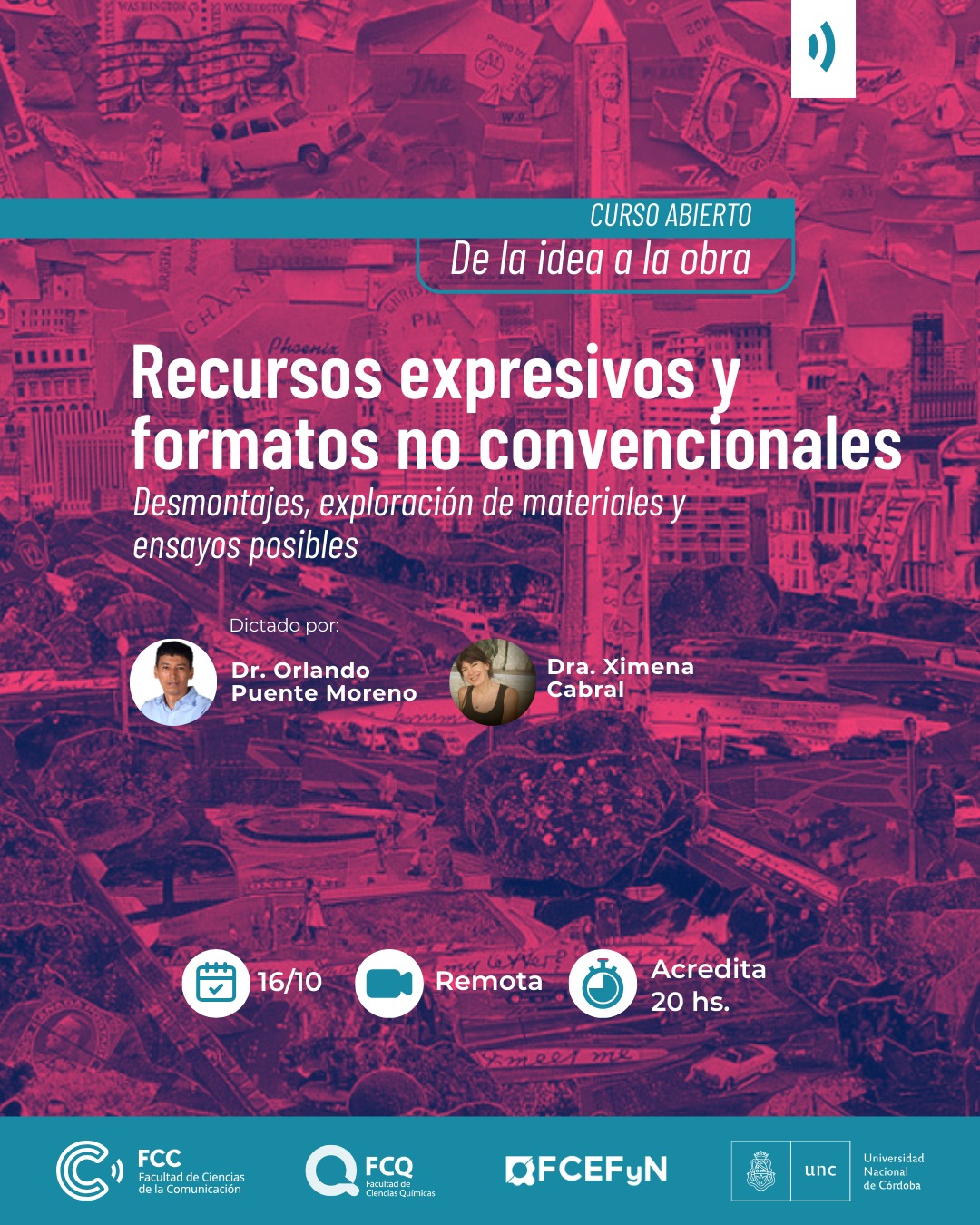 Se encuentra abierta la inscripción al curso Recursos expresivos y formatos no convencionales. Desmontajes, exploración de materiales y ensayos posibles (Unidad 5 y 6). Dictado por: Dra. Ximena Cabral, junto al Dr. Orlando Puente Moreno.