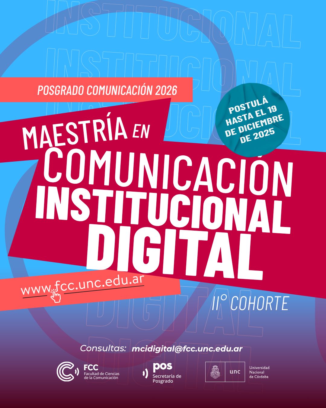 La Facultad de Ciencias de la Comunicación de la Universidad Nacional de Córdoba, Argentina ofrece esta carrera de posgrado, que cuenta con reconocimiento CONEAU Nro.EX-2021-103361948-APN-DAC#CONEAU, Sesión Nº 571 y que otorga el título de posgrado: Magíster en Comunicación Institucional Digital.
