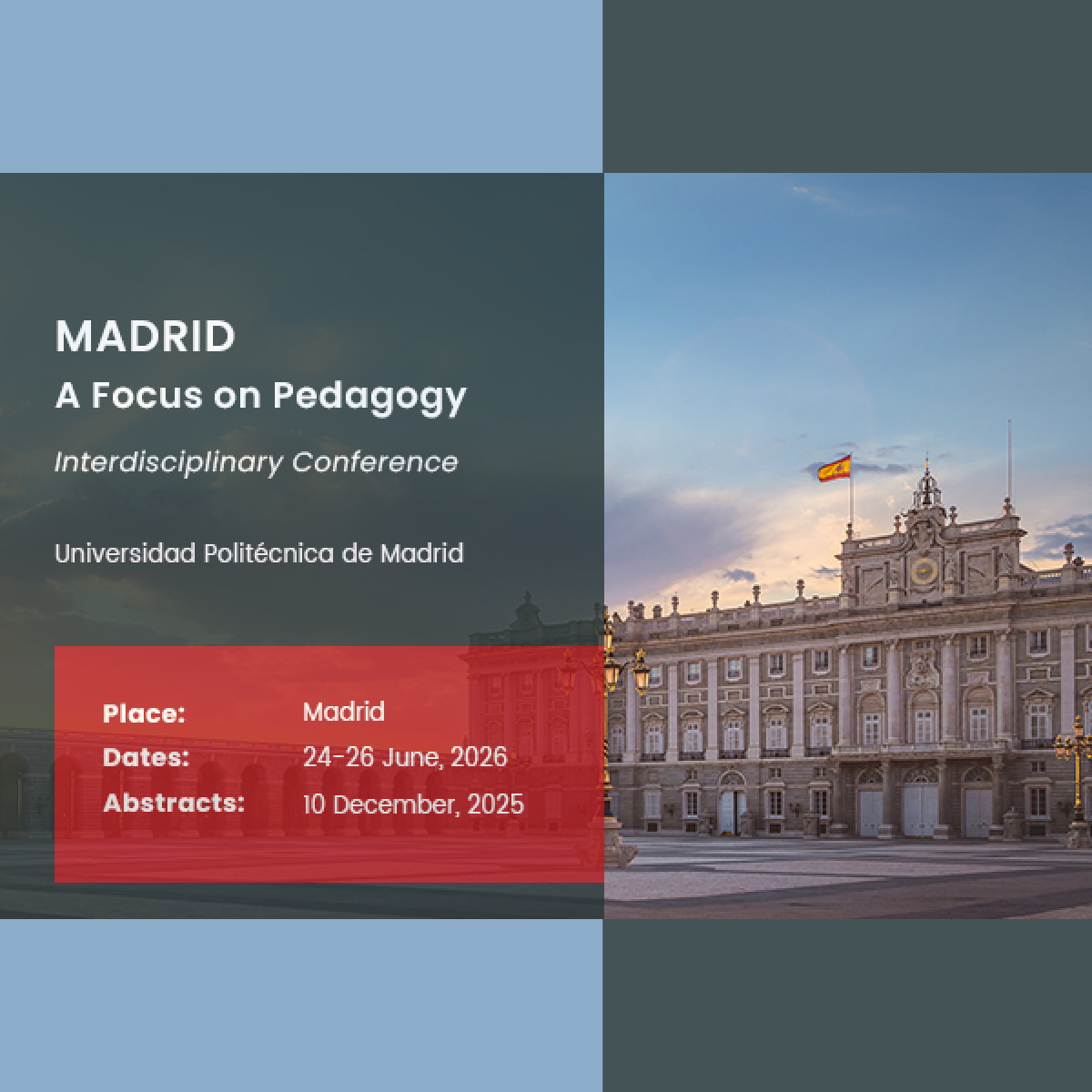 Hasta el 10 de diciembre se recibirán resúmenes para Madrid: Enfoque en la Pedagogía, de la Architecture Media Politics Society. Esta conferencia se nutre de una larga tradición educativa: la ciudad alberga la Real Academia Española, el Instituto Cervantes, de renombre internacional, y algunas de las universidades más antiguas y prestigiosas de Europa.